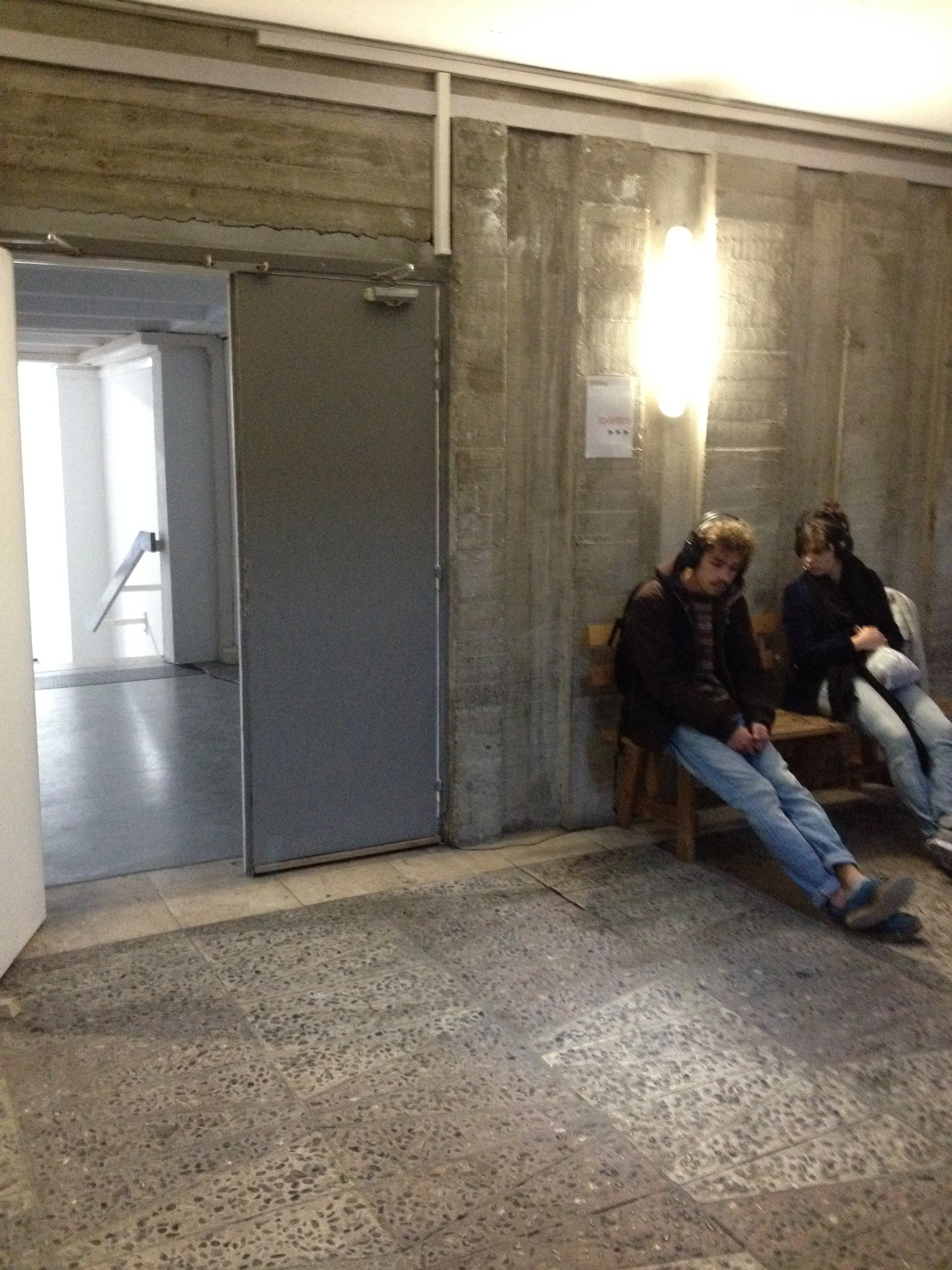 Le plafond, très haut, et l’architecture singulière de ce hall monumental entièrement fait en béton offrent une vue d’ensemble, à partir du banc, sur les aires de circulations, les différents paliers et les entrées vitrées situées de part et d’autre du bâtiment. La position initiale de l’enregistrement étant la même que la position d’écoute, les sons trouvent ainsi leur ancrage dans le lieu réel, leur référence visuelle dans l’espace environnant. Lors de l’écoute, on distingue le changement d’acoustique caractéristique à chacun des deux espaces, alternant entre l’écho du hall et les sons plus définis de la galerie.