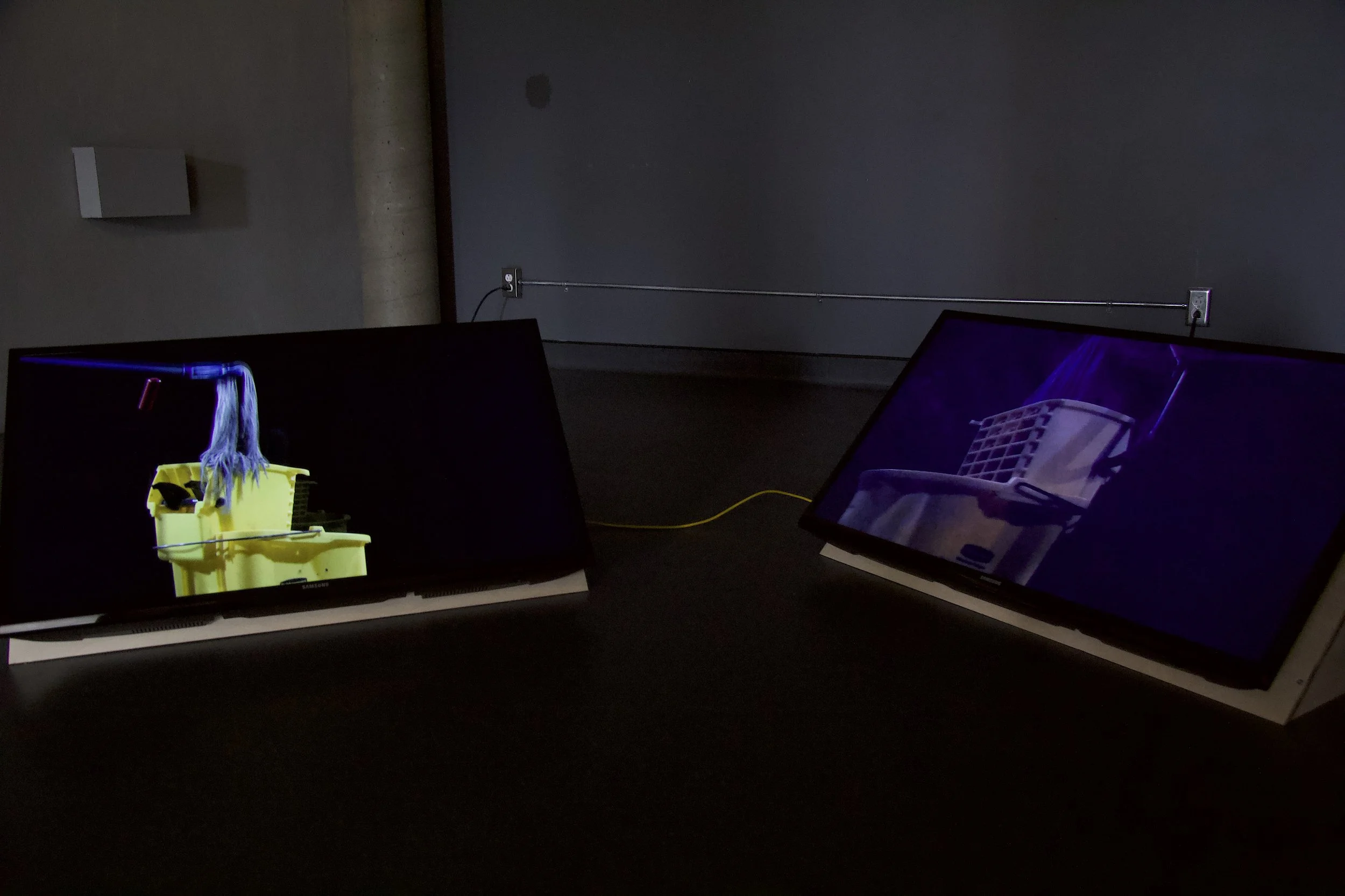 Les deux images vidéo avec son, synchronisées et diffusées en boucle, montrent un environnement anonyme plongé dans le noir - il s’agit d’une salle de répétition du théâtre adjacente- et dans lequel figure un objet, soit un bac à serpillère jaune et son manche à balais-moppe bleu. Son apparition à l’écran est dédoublée, d’une part par le dispositif de présentation (les deux moniteurs), et d’autre part par la manière dont les images ont été tournées initialement - deux caméras se faisant face à une certaine distance, l’une fixe, l’autre dans un mouvement linéaire régulier (travelling), filment simultanément les actions menées par la manipulation de l’objet qui se déplace en roulant et en arpentant le sol. Au centre, une cloison mitoyenne semi-transparente, un grand panneau de plexiglas fumé, sépare le champ de captation des caméras. Sa surface réfléchit en partie l’espace devant elle tout en permettant de voir à travers ce qui se déroule de l’autre côté, un peu comme l'écran d'un téléviseur.