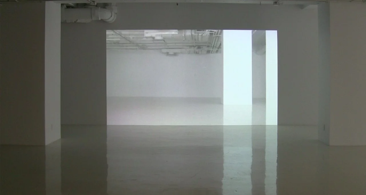 L’une des deux vidéos présentes dans l’installation est projetée en grand format sur le mur face à l’entrée de la salle d’exposition. Elle est cadrée par les deux colonnes blanches, massives et iconiques de la galerie. Le mouvement du film est lent et présente des formes blanches, géométriques et d’apparence abstraite. On réalise que ce sont ces mêmes colonnes qui y sont représentées et que le film a été tourné sur place. Il est le résultat d’une double captation : c’est-à-dire qu’une caméra, dans un mouvement lent de va-et-vient latéral (travelling), a filmé perpendiculairement les deux colonnes, tandis qu’une autre, fixe, filmait de face la projection en simultanée de la première, à l’endroit de la projection finale. C’est cette captation tournée par la deuxième caméra qui a produit le document final. Sous forme de télescopage, il rassemble dans une même image continue deux points de vue de l’espace d’un même moment, sous deux angles différents.
