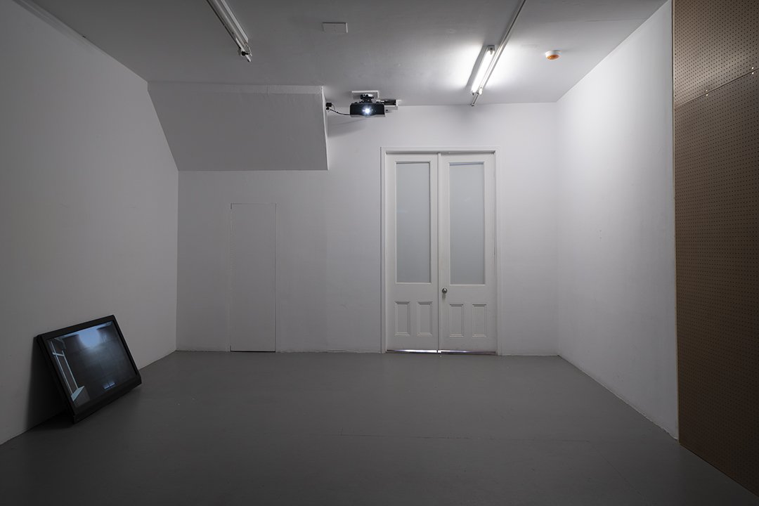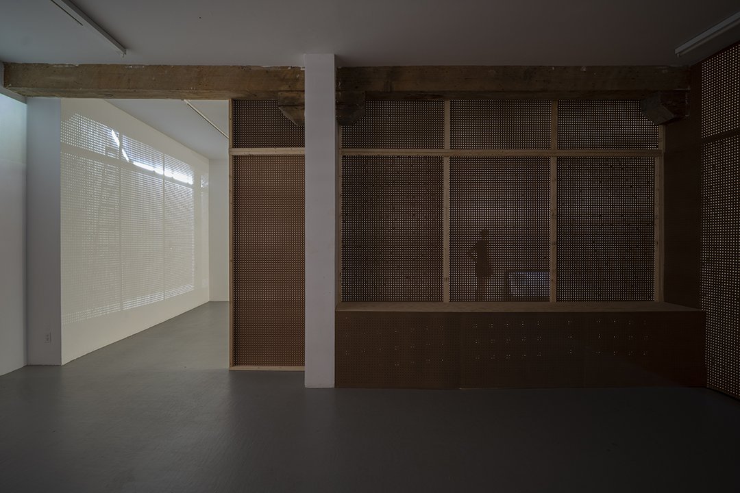 Installation vidéo in situ à trois canaux; panneaux perforés, bois, projecteur (2), luminaires Del (3), écran télévisé, bande sonore.