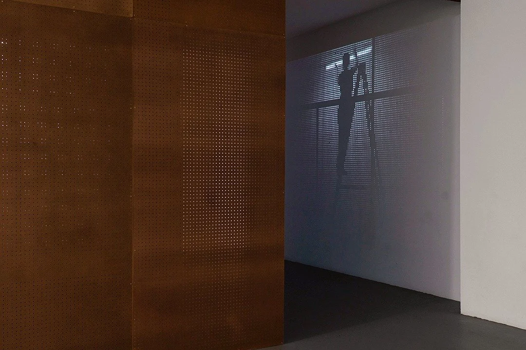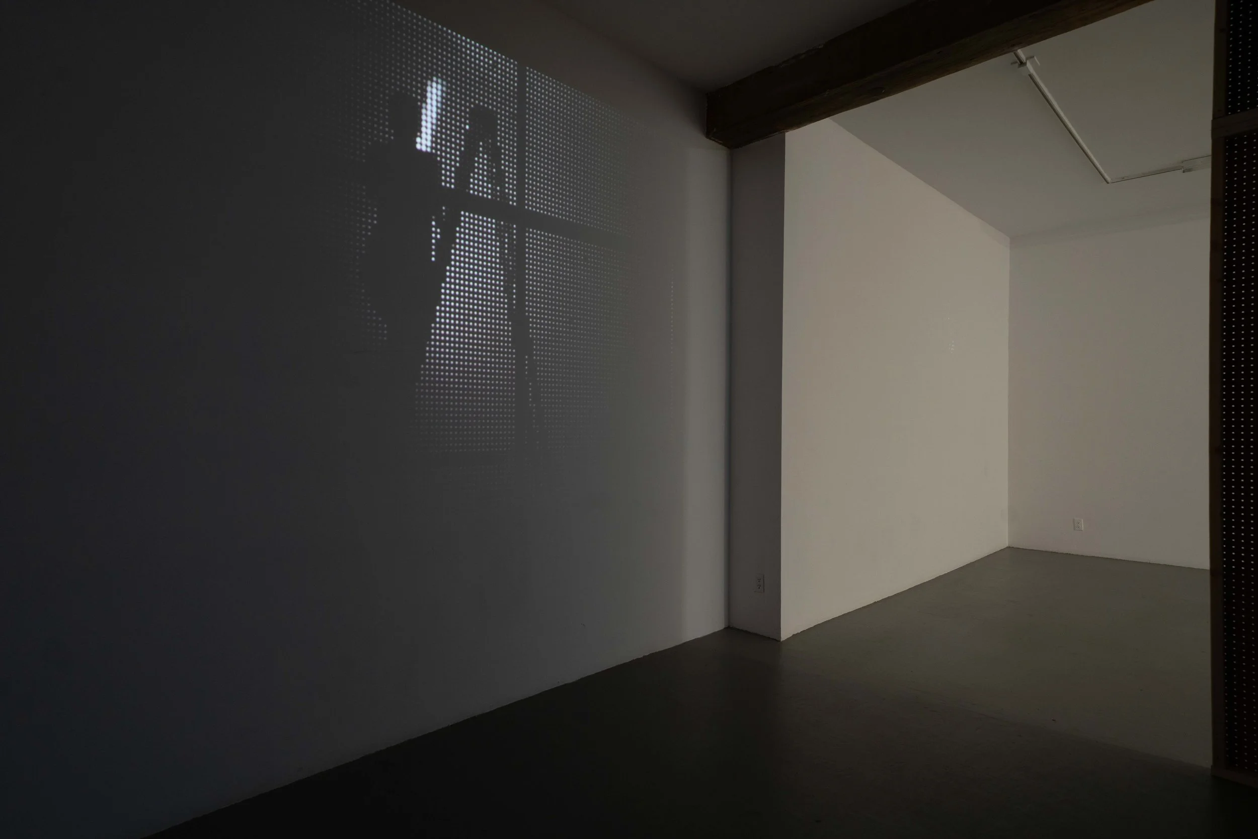 Dans l’installation, des structures de panneaux perforés reconfigurent l’espace initial de la galerie en des lieux distincts, contigus et perméables. C’est à partir de cette nouvelle configuration que s’ancre le dispositif filmique, autant pour la disposition des caméras lors de la prise, que pour la spatialisation des projections. Les séquences projetées commencent par l’ouverture de l’éclairage néon de la salle, effectuée par l’action de l’interrupteur du réseau, ce qui a pour effet d’éclairer effectivement la salle par la luminosité de la projection. Ensuite, une personne procède, avec un escabeau qu’elle déplace au fur et à mesure, à dévisser un à un les tubes du réseau, replongeant progressivement l’espace (l’espace représenté et l’espace réel de la galerie) dans la pénombre. Elle pose ensuite un éclairage alternatif, d’autres lumières plus discrètes (les lampes DEL), à divers endroits de l’installation, qui restent allumées pour la durée de l’exposition. Comme les vidéos sont projetées en boucle, la séquence nous fait passer de pénombre en pénombre, alors que les néons au plafond demeurent fermés. Les visiteurs se déplacent dans l’espace de l’installation, ils sont perceptibles d’un lieu à l’autre, à travers les écrans perméables, comme des images. Les vidéos projetées s’actualisent simultanément à notre propre expérience du lieu faisant cohabiter des réalités qui s’« ignorent » normalement (devant/derrière, ici/là-bas, avant/pendant).